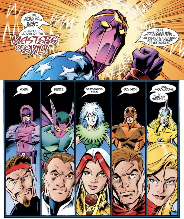 “Heroes Reborn” was also tied to the rise of the Thunderbolts, a new super-team that stepped in to fill the vacuum left by the absence of the Avengers and Fantastic Four in the mainstream Marvel universe. One of the greatest plot twists in Marvel history came at the end of Thunderbolts #1 when it was revealed that the Thunderbolts were actually the Masters of Evil: villains masquerading as heroes. Their leader was none other than Baron Zemo.
